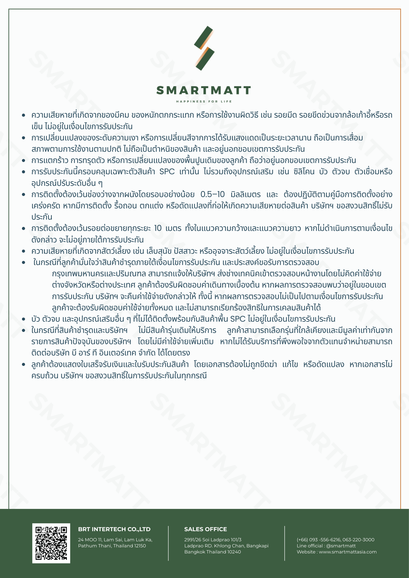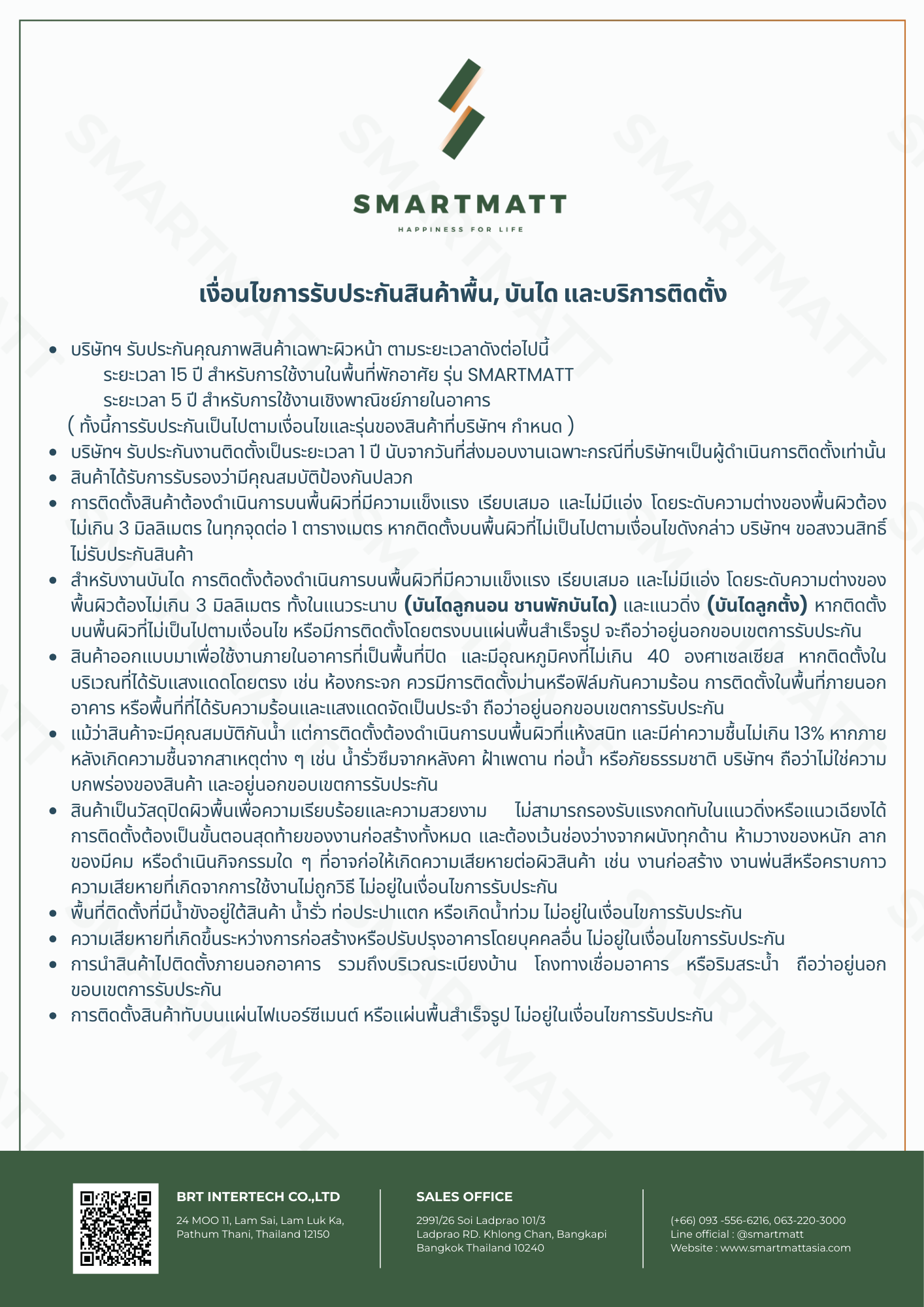 - กรณีตอกการติดตั้งพื้น โดยไมรอให งานติดตั้งฝา งานติดตั้งอุปกรณไฟฟา งานติดตั้งวงกบประตูงานติดตั้งหนาตา งานติดตั้งราวเหล็กบันได และงานทาสรอบ2 ยังไมเสร็จเรียบรอย บริษัทจะไมรับประกันสินคาทุกกรณ